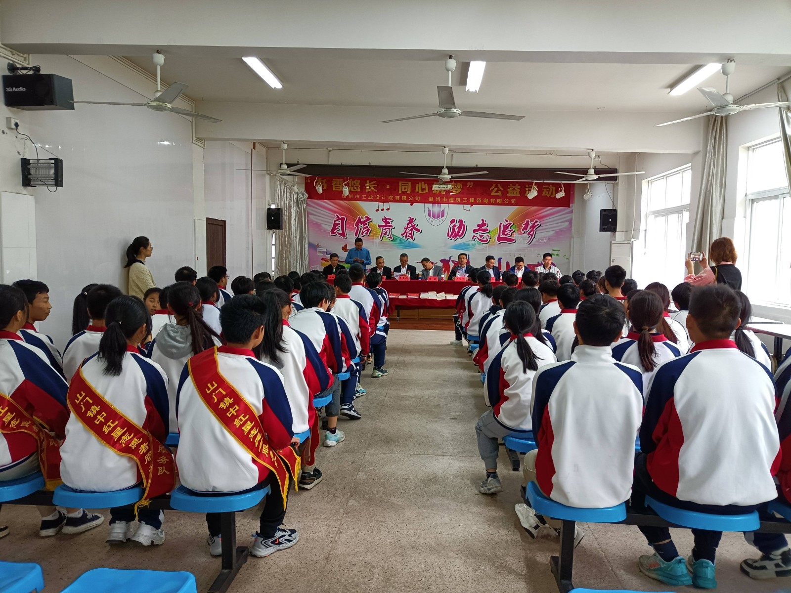 本次活動在雄偉莊嚴的國歌聲中拉開了帷幕,山門鎮(zhèn)黨委副書記、鎮(zhèn)長蘇斌,山門鎮(zhèn)初級中學書記、校長蘇連福首先對工業(yè)院、建設(shè)咨詢公司一行的到來表示歡迎,對兩支部關(guān)心老區(qū)教育,心系老區(qū)學子,熱心公益事業(yè)致以衷心的感謝。蘇斌表示,學校今后將大力開展閱讀活動,努力打造書香校園,希望學生們通過閱讀打開通往世界的大門。同時,他教導學生們要以感恩之心暢享閱讀、沐浴書香,以優(yōu)異的成績來報答社會的關(guān)愛之情。